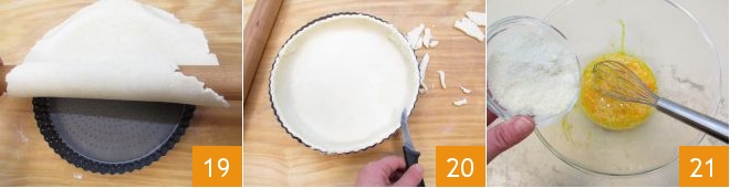 enrolla la masa en el rodillo y colócala dentro de un molde perforado (si no tienes uno, entonces procede engrasando y enharinando primero) 19; elimina con un cuchillo el exceso de masa 20. En un bol grande, mezcla los huevos con el pecorino 21,