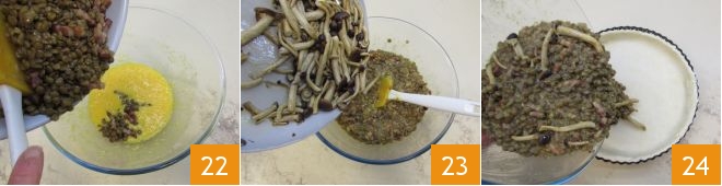 añade las lentejas 22 y los chiodini 23, ajusta de sal y pimienta y, después de mezclar bien, vierte la mezcla en el molde 24.
