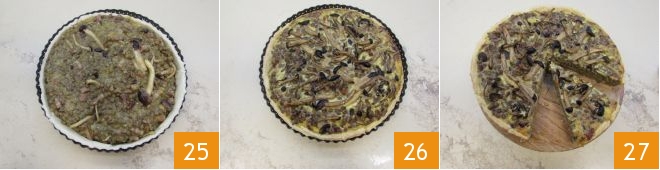 Nivela 25 y cocina en horno estático precalentado a 200° durante 30 minutos, luego baja la temperatura a 170° y cocina por 20 minutos más 26. Deja templar antes de sacarla del molde y luego sirve tu tarta salada de setas y lentejas 27!
