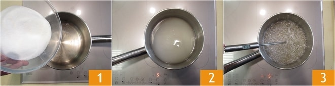 Para preparar la tarta semifrío, comienza con el merengue. Vierte en un cazo el agua y el azúcar, dejando aparte un par de cucharadas 1. Calienta a fuego medio 2 y controla siempre la temperatura con un termómetro de cocina 3. El jarabe deberá alcanzar los 121°.