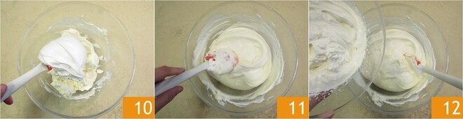 Luego, incorpora poco a poco el merengue 10, mezclando delicadamente de abajo hacia arriba 11. Finalmente, añade la nata semimontada en tres tiempos, asegurándote de no desmontarla 12.