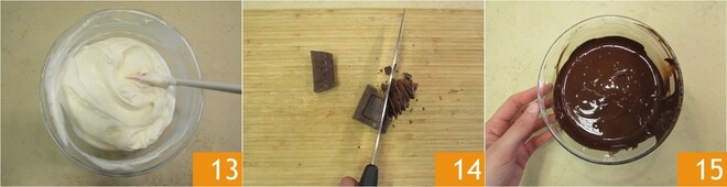 Deberás obtener una mezcla lisa y bien montada 13. Cubre con film transparente y transfiere a la nevera hasta su uso. Ahora ocúpate del chocolate: tritura groseramente 400 g de chocolate 14 y derrítelo al baño maría o en microondas 15.