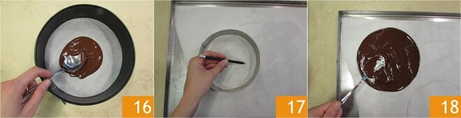 Mientras tanto, forra un molde desmontable de 20 cm con papel de horno en la base y con una tira de acetato en los bordes. Vierte dentro 4 cucharadas de chocolate y, ayudándote con el dorso de la cuchara, espárcelo por toda la base 16. Coloca en la nevera. Prepara ahora los otros discos, en total necesitarás 5. Dibuja en el papel de horno 5 circunferencias de 18 cm con un lápiz, ayudándote con un aro de repostería 17. Voltea el papel de horno sobre una bandeja y vierte 2 cucharadas de chocolate por cada círculo. Extiende el chocolate utilizando siempre el dorso de la cuchara 18.