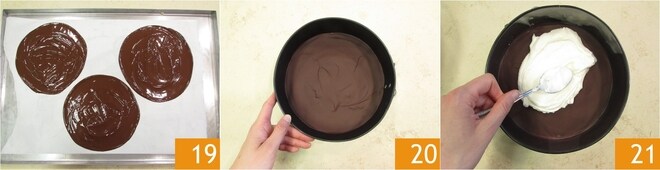 Una vez que hayas obtenido 5 discos de chocolate, transfiérelos al frigorífico y espera a que estén bien sólidos 19. Cuando el chocolate se haya solidificado, retoma el molde 20 y coloca dentro una capa de crema 21.