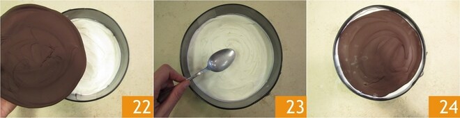 Coloca un disco de chocolate 22 y continúa de esta manera alternando tu crema 23 con los discos. Deberás acabar el dulce con una capa de chocolate 24. Cubre con film transparente y coloca en el congelador durante al menos 6 horas.