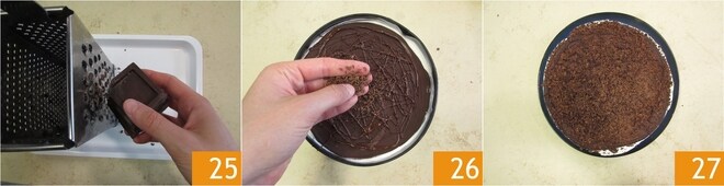 Ralla los 100 g de chocolate restantes 25. Si te ha sobrado más chocolate, viértelo con un tenedor sobre el dulce; si se ha solidificado, puedes derretirlo nuevamente. Añade el chocolate rallado 26, desmolda el dulce, transfiérelo a un plato y sirve la tarta semifrío 27.