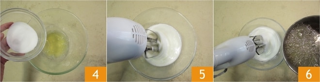 Cuando haya alcanzado los 115°, podrás comenzar a montar las claras. Viértelas en un bol, añade el azúcar restante 4 y bátelas con las varillas eléctricas 5 hasta que estén bien firmes. En el momento en que el jarabe haya alcanzado los 121°, viértelo en las claras en forma de hilo, siempre con las varillas en acción 6.