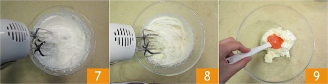 Continúa batiendo con las varillas hasta que la mezcla se haya enfriado. Ahora limpia las varillas y monta la nata, no deberá estar completamente montada, sino semimontada 8. Ablanda en un bol grande el mascarpone, trabajándolo con una espátula 9.