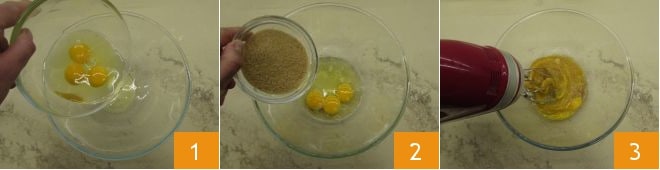 Para preparar la tarta sin lactosa, como primer paso, vierte los huevos en un bol 1, añade el azúcar moreno 2 y bate durante un minuto con una batidora eléctrica 3.