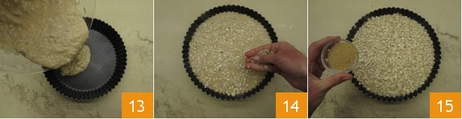 Vierte la mezcla en un molde de 21,5 cm de fondo y 25 cm en la superficie previamente engrasado. Decora la superficie con copos de avena 14 y azúcar moreno 15.