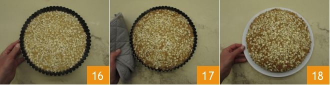 En este punto 16 hornea en horno estático precalentado a 180° durante 30 minutos, luego cambia a modo ventilado y hornea durante otros 5 minutos para caramelizar ligeramente la superficie del dulce. Saca del horno 7 y deja enfriar antes de desmoldar y servir el dulce 18.