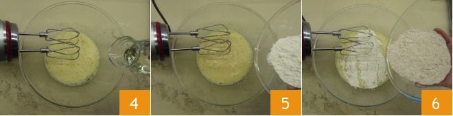 Con las varillas en funcionamiento, añade el aceite en hilo 4. Luego, añade la harina tamizada 5, la integral 6,