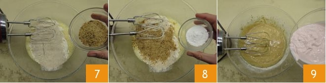 la de avellanas 7 y la levadura tamizada 8. Sigue trabajando con las varillas hasta obtener una mezcla homogénea. Luego, añade el yogur 9,