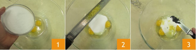 Para realizar la tarta sin leche, verted en un bol los huevos y el azúcar 1, la ralladura de medio limón y las semillas de la vaina de vainilla 3.