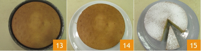 Haced la prueba del palillo antes de sacar del horno 13, luego dejad enfriar y desmoldad la tarta sin leche 14. Espolvoread con azúcar glas y servid 15.