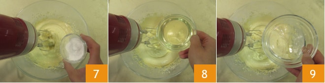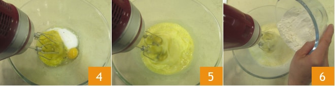 Con las varillas eléctricas, batid todo a velocidad media 4 hasta obtener una mezcla espumosa 5. Luego añadid toda la harina de una vez 6 y continuad batiendo para que se absorba.