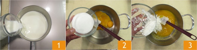 Para preparar la tarta suave con crema, nata y fresas comienza con la crema pastelera. Calienta la leche en un cazo hasta que llegue al primer hervor 1. Bate las yemas con el azúcar 2 y la maicena 3.