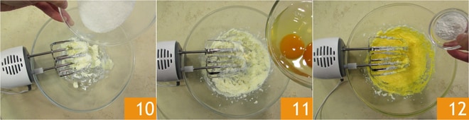 Comienza a trabajarla con las varillas eléctricas. Apenas se haya ablandado añade el azúcar 10 y continúa batiendo la mezcla hasta que esté cremosa. Agrega el primer huevo 11 y trabaja con las varillas eléctricas hasta que esté bien absorbido. Luego agrega también el segundo huevo y trabaja hasta que también esté completamente amalgamado. Ahora añade la levadura 12.