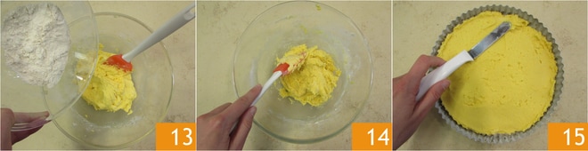 Vierte una parte de la harina 13. Mezcla de nuevo con las varillas eléctricas. Luego añade la harina restante y mezcla con una espátula, hasta que obtengas una mezcla homogénea 14. Ahora viértela en un molde inteligente de 22 cm de diámetro, previamente engrasado, y nivélala con una espátula acodada 15. Hornea en horno estático precalentado a 180° durante unos 25 minutos.