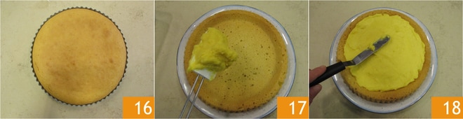 Una vez lista la tarta, sácala del horno y déjala templar a temperatura ambiente 16. Cuando esté completamente fría podrás volcarla sobre un plato. Recupera la crema y extiende una capa en el centro, en el hueco creado por el molde inteligente 17. Ten en cuenta que debes reservar unos 100 g de crema pastelera. Distribuye uniformemente con la espátula 18.