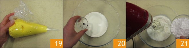 Coloca los 100 g de crema restantes en una manga pastelera sin boquilla, puedes mantenerla en la nevera hasta el momento de usar 19. En un bol vierte la nata bien fría y las semillas de la vaina de vainilla 20. Monta con las varillas eléctricas añadiendo poco a poco el azúcar glas 21.