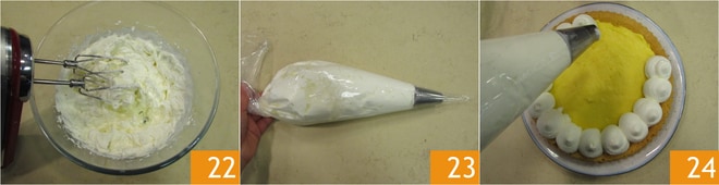 Cuando la nata esté espumosa 22, transfiérela a una manga pastelera con boquilla lisa de 18 mm de diámetro y mantenla en la nevera 23. Decora la tarta: exprime unos copos de nata en el borde 24.