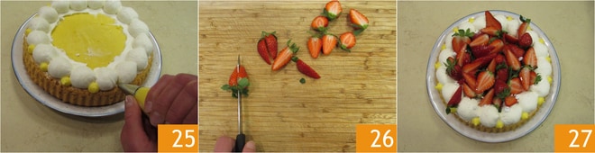 Exprime también unos copitos de crema entre cada copo de nata 25. Lava las fresas y córtalas en gajos 26. Completa la tarta colocando las fresas en el centro y algunos merengues desmenuzados. La tarta está lista para ser servida 27.