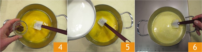 Una vez obtenido un compuesto liso y homogéneo, aromatiza con el extracto de vainilla 4. Vierte un poco de leche caliente, para templar y mezcla con la espátula 5. Luego vierte la leche restante y vuelve a poner todo a fuego lento. Cocina durante algunos minutos y mezcla continuamente 6, hasta que la crema se haya espesado.