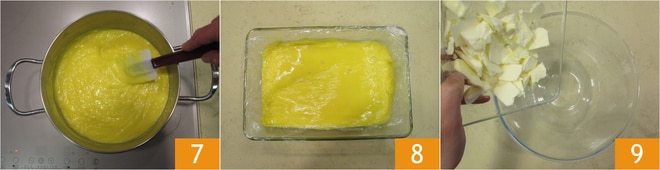 Una vez lista 7, transfiere la crema a una fuente baja y amplia y cubre con film transparente en contacto 8. Deja enfriar a temperatura ambiente y luego lleva al frigorífico. Mientras tanto, prepara la base de la tarta suave: en un bol pon la mantequilla en trozos 9.