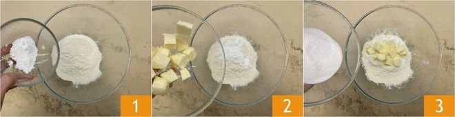 Para preparar la tarta Susanna, comienza por la masa quebrada. En un bol, vierte la harina, la levadura 1, la mantequilla en cubos 2 y el azúcar 3.