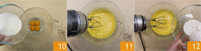 Mientras tanto, prepara la crema. Vierte las yemas y el azúcar en un bol 10 y bátelas con una batidora eléctrica 11. Cuando estén claras y espumosas, añade la ricotta bien escurrida 12.