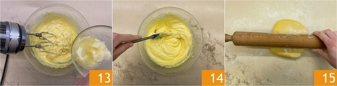 Sigue trabajando con las varillas para incorporar la ricotta. Calienta la mantequilla durante 30 segundos en el microondas y añádela a la mezcla 13. Mezcla nuevamente hasta incorporarla a la crema 14, luego guarda en la nevera. Recupera la masa quebrada y extiéndela con un rodillo sobre una superficie ligeramente enharinada 15.