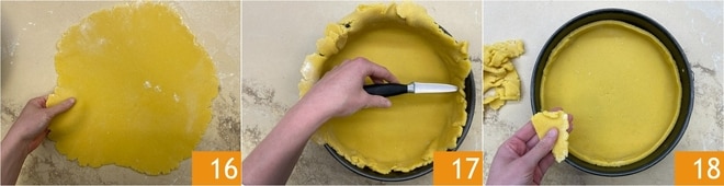 Debes obtener un grosor uniforme de aproximadamente 4 mm 16. Luego transfiere la masa al interior de un molde de 24 cm y haz que adhiera bien. Luego corta el exceso de masa, dejando un borde de 2-2,5 cm 17 18. Guarda en la nevera durante 30 minutos. Este paso ayudará a mantener la forma durante la cocción.