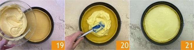 En este punto, transfiere la crema al interior 19 y nivélala con una espátula 20 21. Cocina en horno estático precalentado a 175° durante 40 minutos.