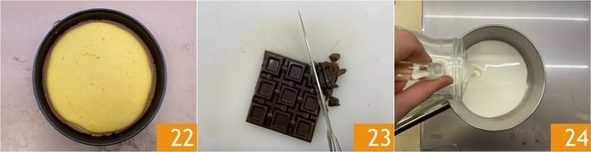 Pasados los 40 minutos, saca la tarta del horno 22 y deja que se enfríe. Mientras tanto, prepara la cobertura: pica finamente el chocolate negro 23. Vierte la nata en un cazo 24.
