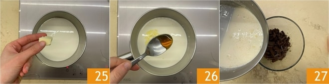 Añade la mantequilla 25, la miel 26 y caliéntala. Tan pronto como esté a punto de hervir, apaga el fuego y viértela en el chocolate 27.