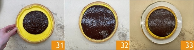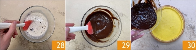 Mezcla con una espátula 28 hasta obtener una mezcla brillante y homogénea 29. Deja que se entibie, removiendo de vez en cuando, y viértela en el centro de la tarta 30.