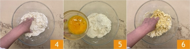 Amasa con las manos hasta obtener una mezcla desmenuzada, luego añade también los huevos 5 y sigue amasando con las manos 6.