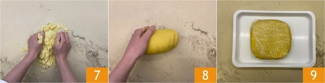Cuando la mezcla comience a tomar forma, pásala a una superficie y trabaja rápidamente con las manos 7 hasta obtener una masa homogénea 8. Envuelve la masa en papel film 9 y déjala reposar en la nevera durante unos 30 minutos.