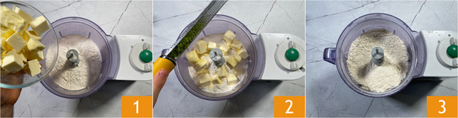 Para preparar la tarta tropical, empezad por la Pasta quebrada: en un robot de cocina con cuchillas unid la harina con la mantequilla fría en dados 1 y la ralladura de lima 2, luego triturad hasta obtener una mezcla arenosa 3.