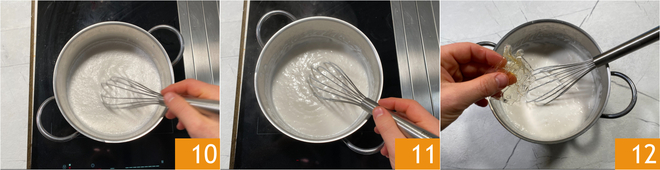 Llevad al fuego y cocinad durante unos 10 minutos, removiendo constantemente 10; si empieza a hervir, apartad del fuego. Cuando la crema haya espesado 11, apagad y añadid la gelatina 12.