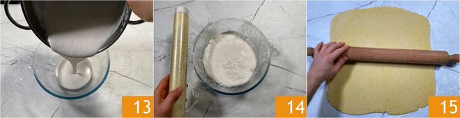 Verted la crema en un bol 13, cubrid con film a contacto y dejad enfriar en el frigorífico al menos una hora 14. Transcurrido el tiempo de reposo de la masa, extendédla a 0,5 cm de espesor sobre la superficie ligeramente enharinada 15.