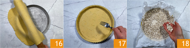 Colocad la masa en un molde desmontable para tartas de 27 cm de diámetro, engrasado y enharinado 16, y pinchad con un tenedor 17. Cubrid con una hoja de papel de horno, añadid legumbres secas (o las esferas de cerámica específicas) y Cómo hacer la cocción a ciegas a 170 por 20 minutos 18.