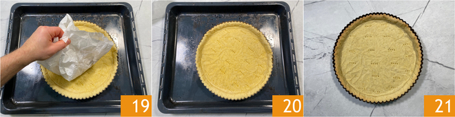 Transcurrido el tiempo de cocción, retirad el papel de horno con los pesos 19 y proseguid la cocción otros 10 minutos a 180 20. Sacad del horno y dejad enfriar la base 21.