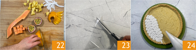 Dedicaos a la decoración: limpiad la fruta y cortadla: la piña en triángulos, la papaya en cubitos, el coco en láminas finas con un pelapatatas y el mango en tiras 22. Cortad la punta de una manga pastelera en diagonal 23 y rellenadla con la crema de coco fría. Luego rellenad la base de la tarta con la crema formando un motivo decorativo 24.