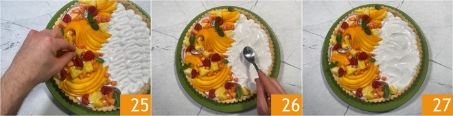 Colocad sobre la superficie los trozos de fruta, incluidos los frambuesas y alguna hojita de menta 25, luego dad un poco de movimiento a la crema con el dorso de una cucharita 26. ¡Vuestra tarta tropical está lista para servir 27!