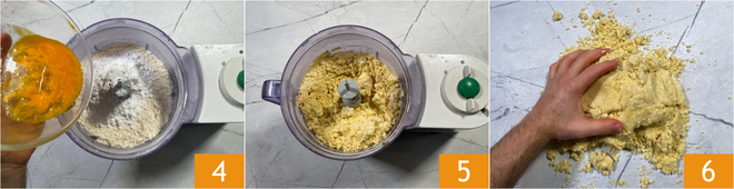 Añadid el azúcar glas y los huevos 4 y poned en marcha el robot unos instantes más 5. Volcad la masa sobre la superficie de trabajo y amasad rápidamente a mano 6, sólo el tiempo de formar un paquete. Envolvedlo en film transparente y dejadlo reposar en el frigorífico durante una hora.
