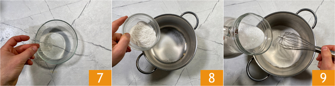 Pasad a la crema de coco: poned en remojo la gelatina en agua fría 7. Mezclad la harina de arroz y el azúcar en una cacerola 8, luego verted la leche de coco mientras removéis con un batidor para evitar la formación de grumos 9.