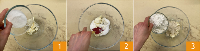 Para preparar la tarta vegana, empezad por la masa: en un bol unid la mantequilla vegana con el azúcar 1 y trabajad con una espátula para mezclarlos 2. Cuando obtengáis una mezcla cremosa, añadid la harina tipo 1 y la harina de castaña 3.