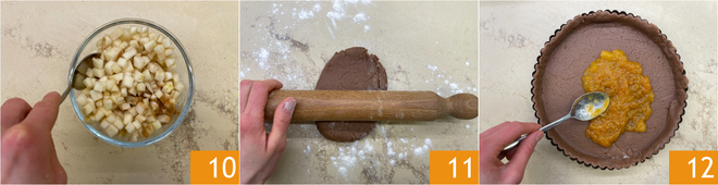 La masa quebrada vegana, preparada con harina tipo 1 y harina de castaña, Mantequilla vegana y bebida de avena, tiene una consistencia compacta pero delicada, enriquecida con una ligera nota de cacao. El resultado es una corteza fragante que acoge un relleno de peras aromatizadas con canela y ralladura de limón, enriquecidas con mermelada al gusto para un toque aún más delicioso.